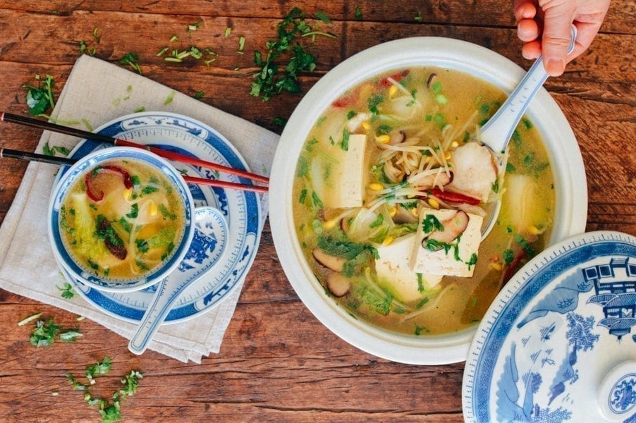 Добавьте бульон, воду, капусту, тофу и кунжутное масло. Доведите до кипения и добавьте соль по вкусу.