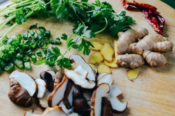Подготовьте ингредиенты для супа. На тонкие ломтики порежьте имбирь. Пошинкуйте лук и кинзу. Если грибы большие, также нарежьте их на кусочки поменьше.