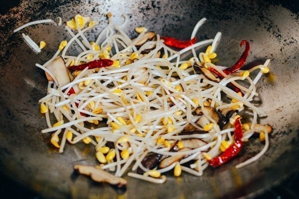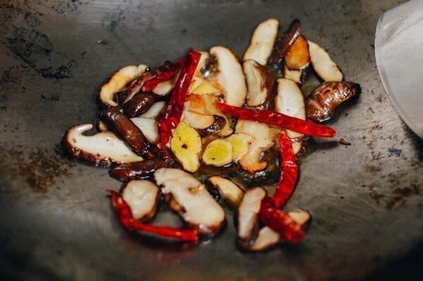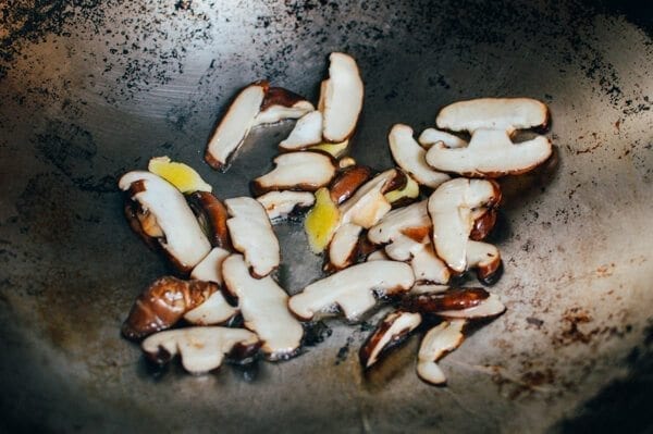В вок, кастрюлю с толстым дном или большую сковороду добавьте растительное масло и нагрейте на среднем огне. Выложите грибы и имбирь и жарьте около 2-х минут, пока они слегка не подрумянятся и не появится аромат.