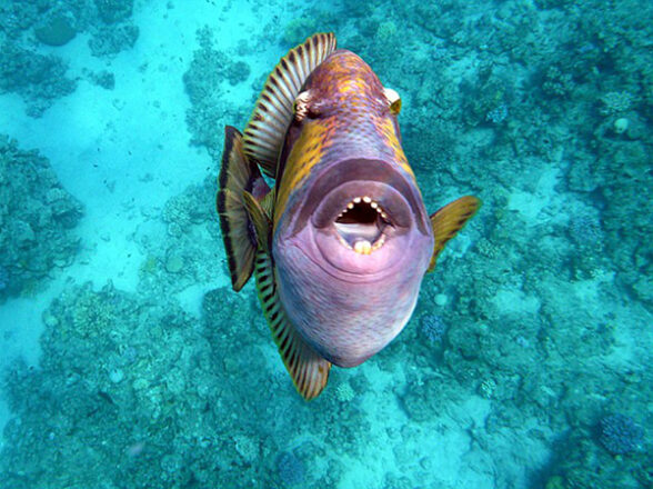 Рыба триггер (синеперый балистод) – обитатель коралловых рифов, известный капризным характером и легко переходящий от безучастного равнодушия к атакующей агрессии. Опытные дайверы предпочитают держаться от него на безопасном расстоянии, поскольку настроение балистода трудно предвидеть.