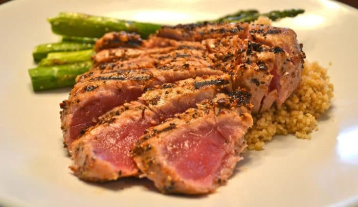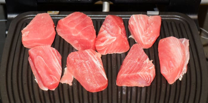По рецепту пожарить на электро-гриле с каждой стороны по 3-4 минуты, чтобы внутри мясо осталось нежно-розового цвета. Как это видно на фото. Важно, чтобы рыба внутри осталась светлой. То есть не стоит допускать прожаривания полностью. Дело в том, что этот вид рыбы становится сухим если его длительно подвергать термообработке. Не стоит бояться паразитов, ведь в тунце их нет. Именно поэтому в Японии эту рыбу без опаски едят сырой или жарят минимум времени.
