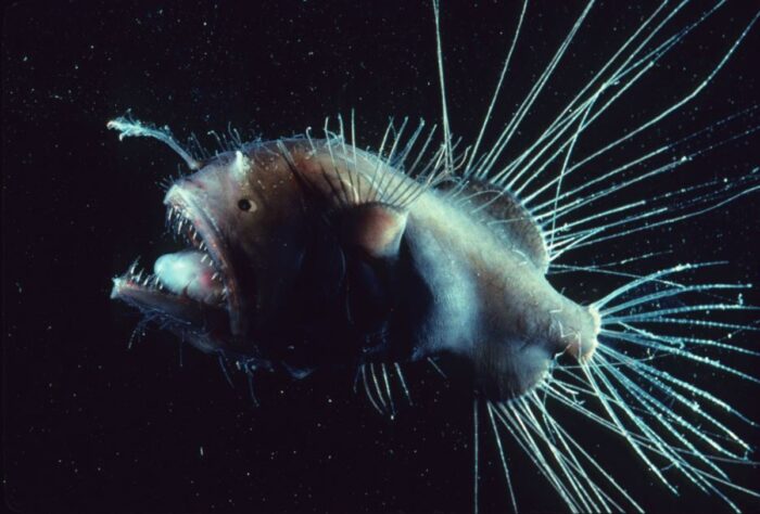 Из-за того, что на этой глубине давление толщи воды достигает внушительных показателей, форма тела у рыбы уплощенная. Ее особенность – мощные и широкие челюсти, иногда с выдвинутой нижней частью. На фото это выглядит устрашающе. Что делает обитателя глубин непривлекательным. А над ней располагается «удочка», но имеется она только у самок.