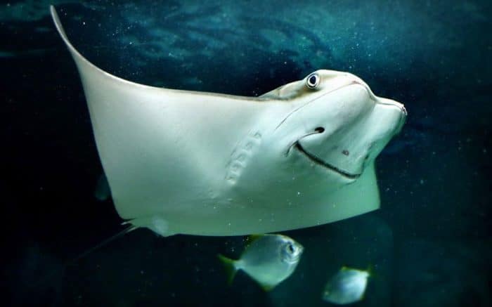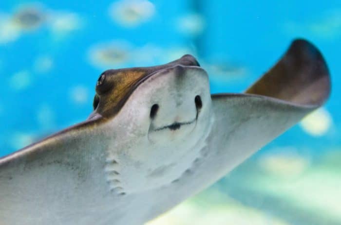 Для того, чтобы скат стал полностью безопасным, ему удаляют ядовитый шип на хвосте. Такого ската посетители могут трогать руками и гладить, не боясь получить ядовитый укол. Самый крупный аквариум, где можно увидеть улыбающихся скатов, находится в Санкт-Петербурге и штате Флорида в США.