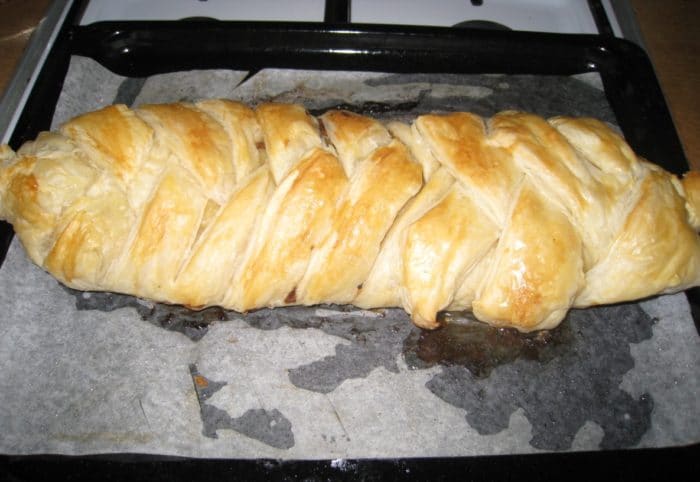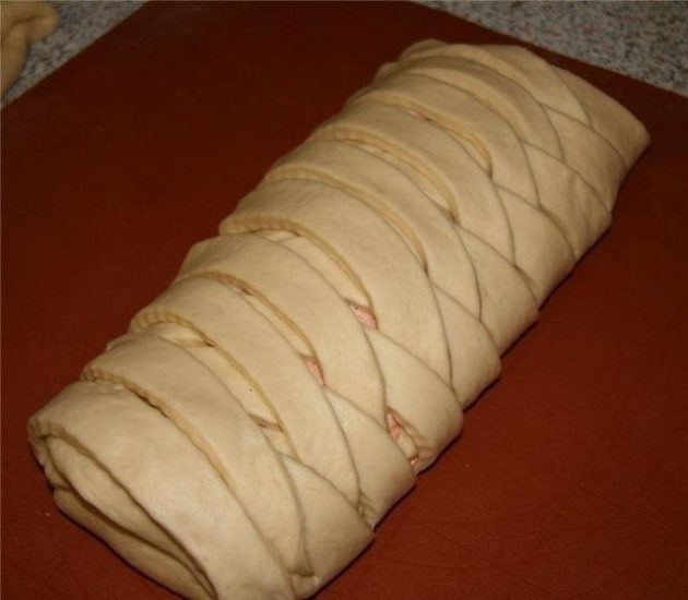 Сделать надрезы по краям пласта, где нет начинки и «заплести» пирог в косичку, прикрывая начинку. Смазать противень маслом и выложить на него пирог.