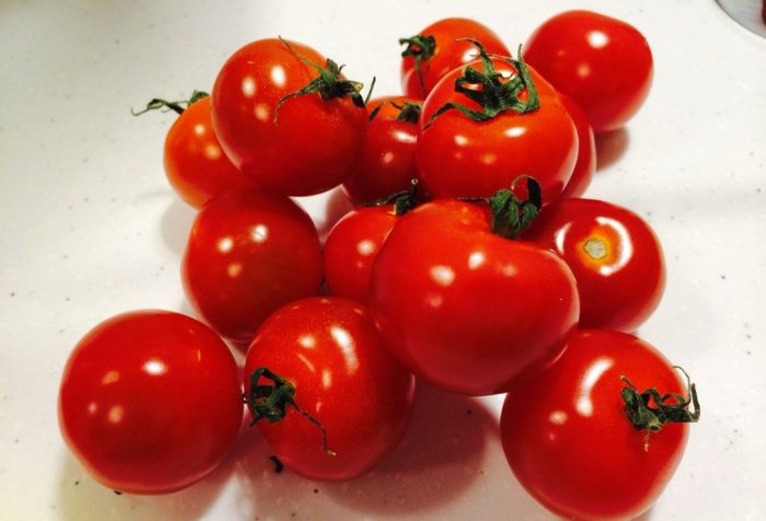 Порезать черри пополам. Положить половинку помидора сверху на смесь шпротов и желтков.