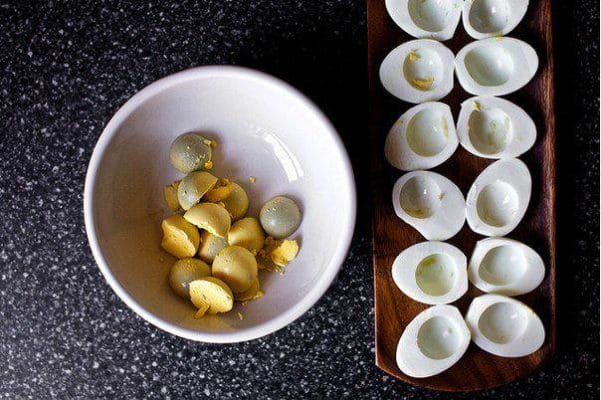 Яйца порезать пополам, желтки вынуть и поместить в отдельную посуду. Белки уложить срезами вверх. Желтки размять вилкой.