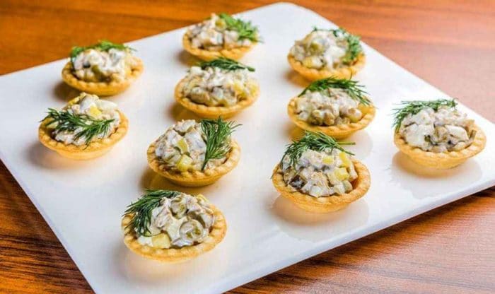 Отличное блюдо готово, его не стыдно подать как на обыкновенный ужин, так и на праздничный стол. Несмотря на немалую калорийность, такие тарталетки съедаются быстрее всего. Конечный вариант приготовленного блюда должен быть похож на следующее фото. Приятного аппетита!