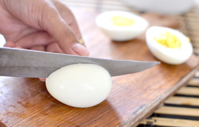 В первую очередь нужно сварить яички. Чтобы яйца не трескались при варке, нужно лишь слегка подсолить кипящую воду.