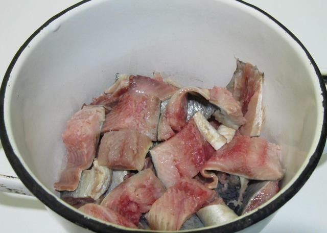 Сложите филе в миску, соль, сахар и перец смешайте, посыпьте кусочки селедки и хорошо перемешайте.