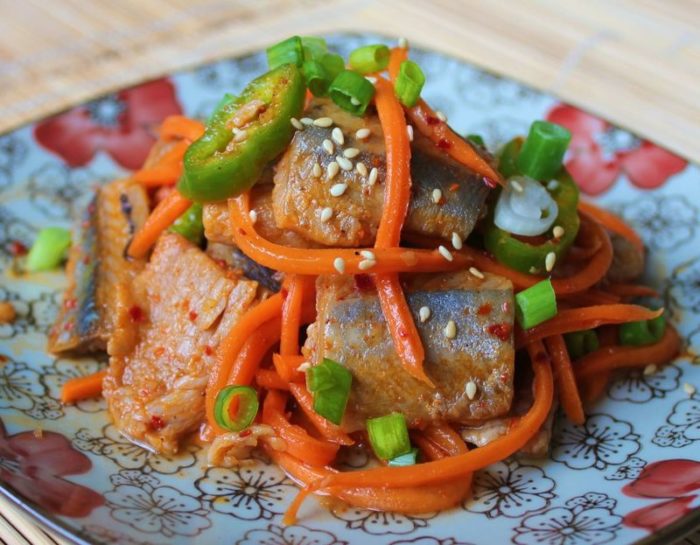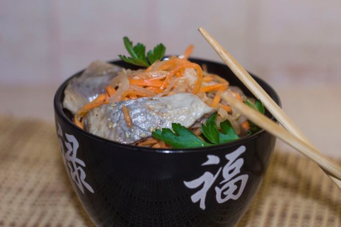 Совет – если попалась не очень сладкая морковь, просто добавьте к уксусу 1 чайную ложечку сахара, когда соберетесь приготовить соус. Контраст вкуса, сочетание соленой рыбки и сладковатых овощей будет просто великолепным и этот рецепт станет вашим любимым.