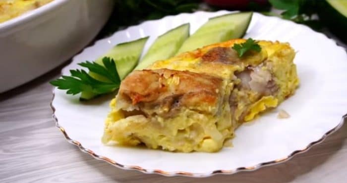 Перевернуть селедку и залить омлетом, жарить пару минут на слабом огне до готовности яиц.