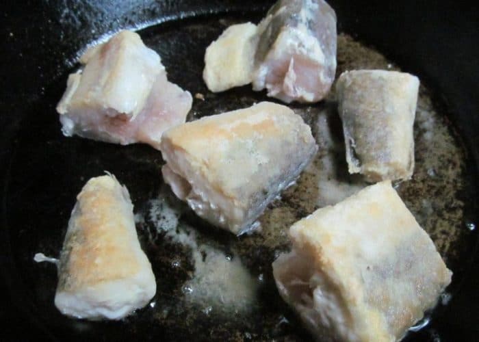 Сковороду с салом разогреть и выложить рыбу шкуркой вниз.