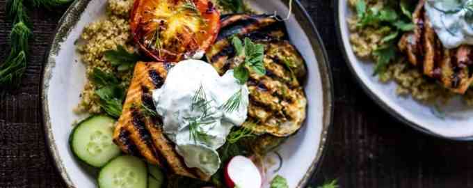 Лосось на гриле с киноа и овощами на гарнир — быстрое и вкусное блюдо для буднего дня. Кроме рыбы, мы также приготовим соус греческой кухни — дзадзики, в.