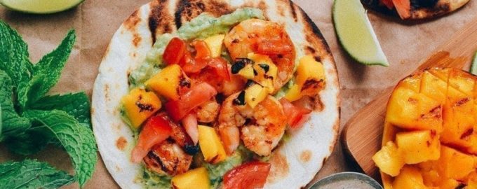 Креветки, поджаренные на гриле, потрясающе сочетаются с соусом гуакамоле. В этом рецепте мы приготовим мятную версию соуса, а кроме креветок обжарим манго