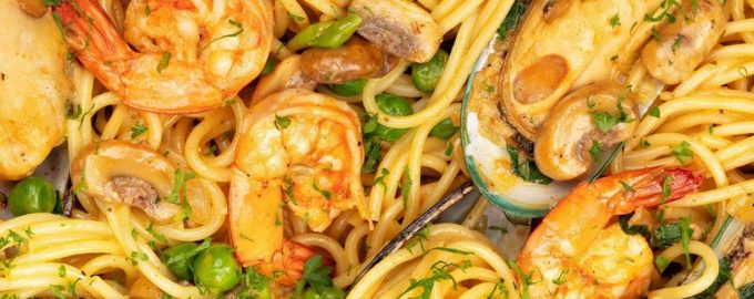 Приготовьте спагетти с морепродуктами в сливочном соусе Альфредо по этому простому рецепту с минимумом продуктов, которые можно найти в любом магазине.