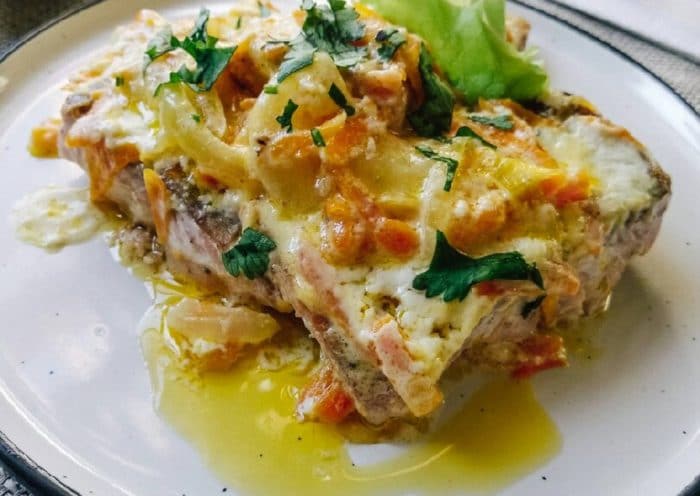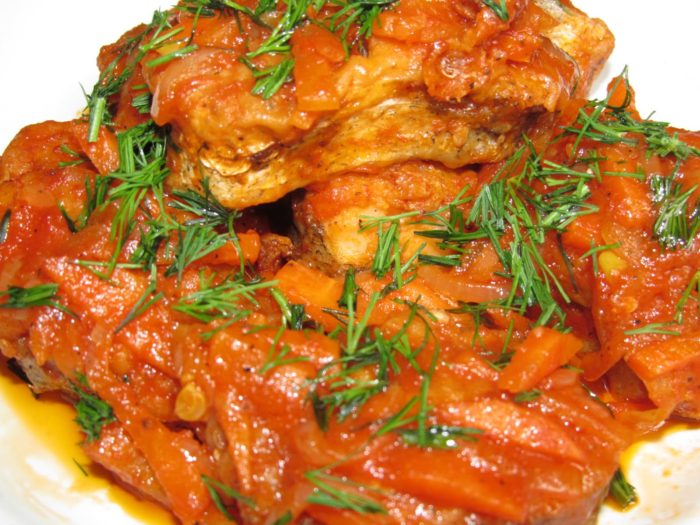 - Выложить рыбку в сметанно-овощной соус.