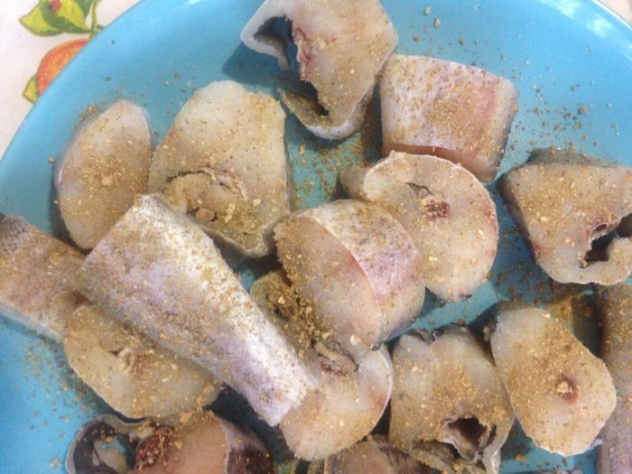 - Рыбу разрезать на куски, положить в маринад.