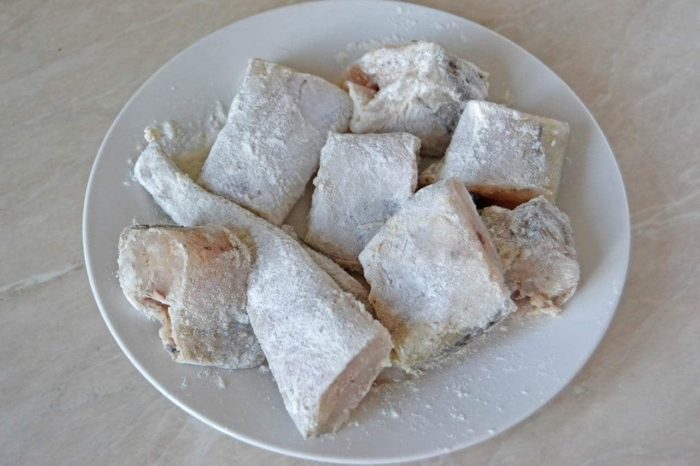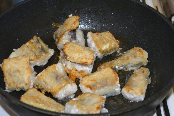 - Посолить кусочки минтая, обвалять в муке и пожарить до красивой корочки на масле.