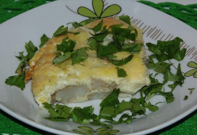 - Залить яичной смесью рыбку.