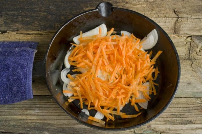 В маленькую кастрюлю положите нарезанный лук с морковью, а сверху кусочки рыбы