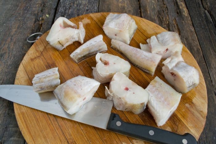 - Для начала надо заняться минтаем. Убрать плавники, отрезать хвост, почистить от чешуи. После промыть под холодной водой и нарезать на куски.