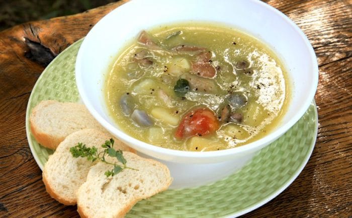 Подавать готовую уху по-ирландски горячей с хрустящими гренками.