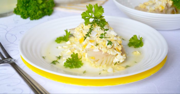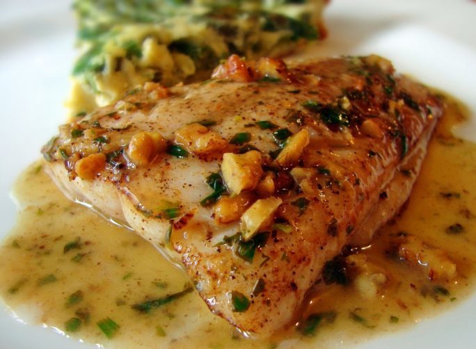 На тарелку выкладывают рыбу и заливают соусом. Для блюда подходит морской тип рыбы с белым мясом, имеющим характерный сладкий привкус. Потому налим сюда вписывается идеально.