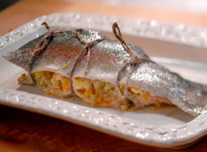 - Нафаршировать овощами рыбу, которую поверх обмазать оставшимся майонезом. Брюшко можно закрепить деревянными шпажками.