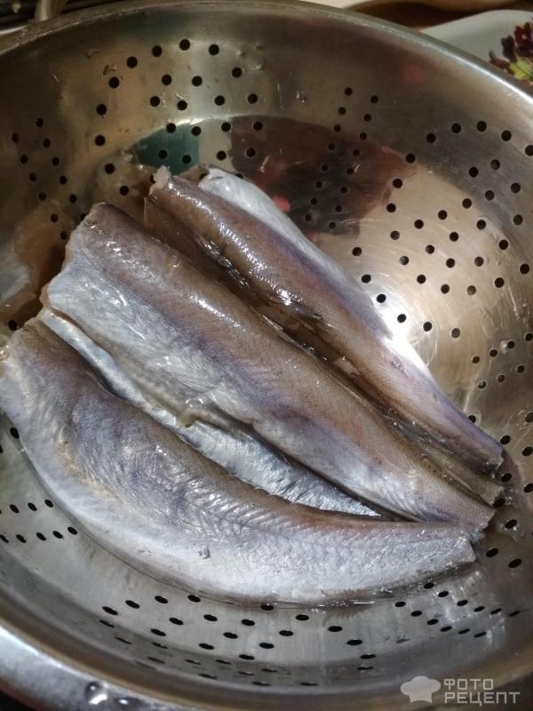 Рыбу в мороженом состоянии разморозить и затем выпотрошить, и отрезать головы с хвостом и плавниками. Интенсивно промыть.