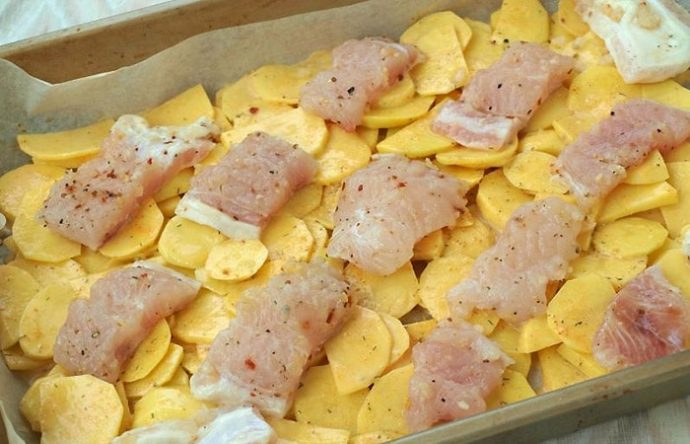 - Картофель хорошо почистить, нашинковать на тонкие брусочки, расположить на противне, смазанном подсолнечным маслом. Рыбку порезать на небольшие кусочки, расположить сверху корнеплода. Все взбрызнуть растительным маслом, посолить, поперчить, добавить прованские травы. Луковицу почистить и нарезать на полукольца, разложить поверх минтая.