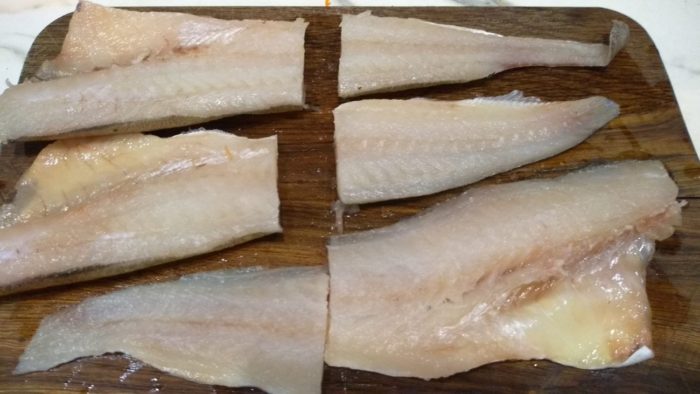 Совершенно не обязательно покупать сразу разделанную рыбку, вполне сойдет и целый минтай, из которого перед готовкой нужно удалить хребет и крупные косточки. Рыбное филе, если необходимо разморозить, промыть и хорошо ужалить влагу с помощью бумажных полотенец. Нарезать на средние брусочки.