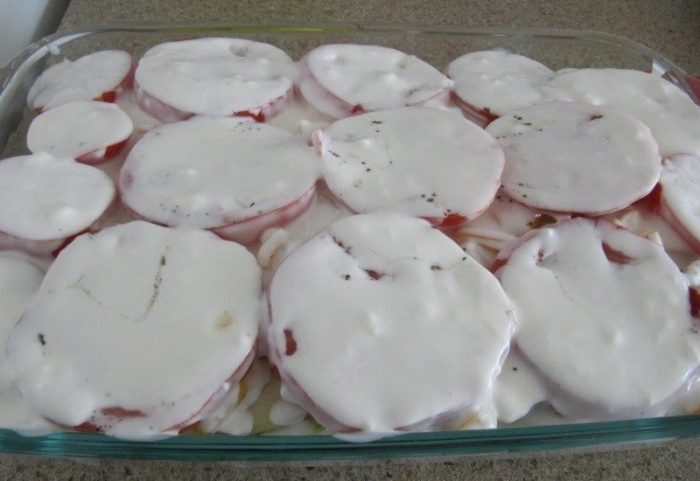 - Теперь можно заняться подготовкой заливки. Для этого в мисочке смешать натертый сыр, сырое яйцо, майонез или сметану. Все взболтать и залить им остальные продукты. Убрать в духовку примерно на час.