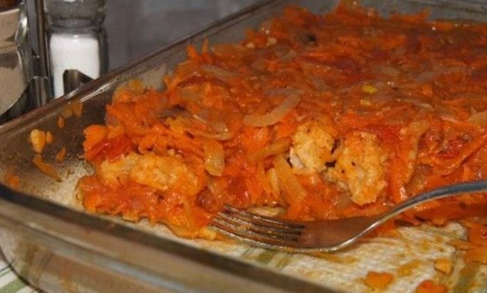 В емкость укладывают вначале рыбы и покрывают ее «подушкой» из обжаренных овощей.