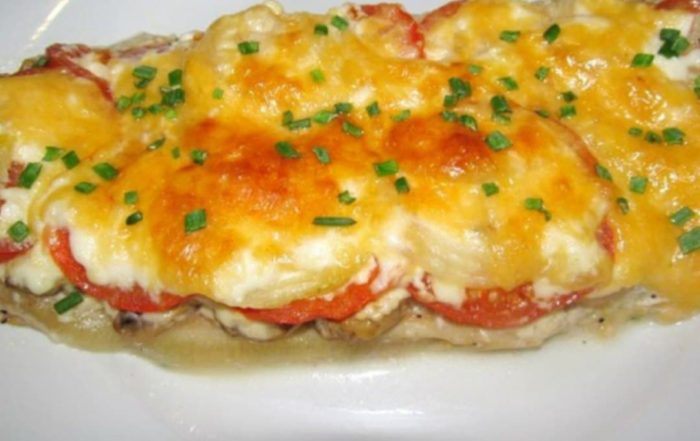 - Положить поверх кусочков, нарезанные кружочками помидоры.