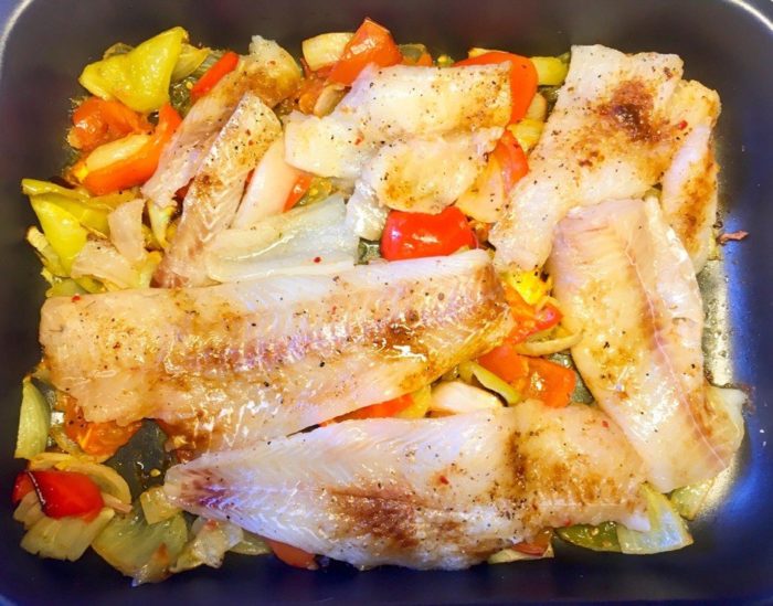 - Отправьте измельчённые овощи к рыбе.