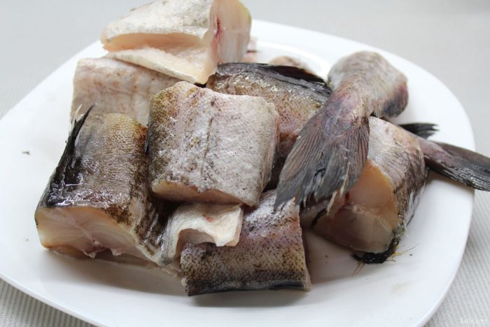 Рыба размораживается, снимается чешуя и потрошится. Тщательно промывается, разрезается на порционные кусочки.