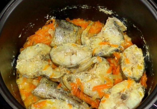 - Закладываем рыбу в чашу мультиварки, сверху распределяем лук, солим, перчим, добавляем приправы. Ставим на режим выпечка примерно на полчаса.