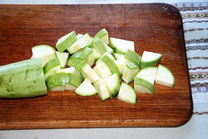 С помидор снимается кожица, предварительно так же промытых. Мякоть крошится на средние кубики
