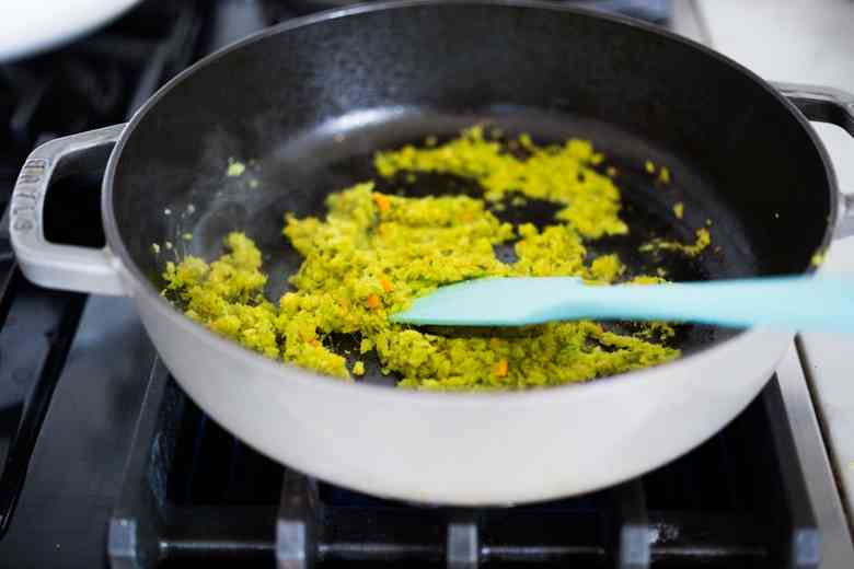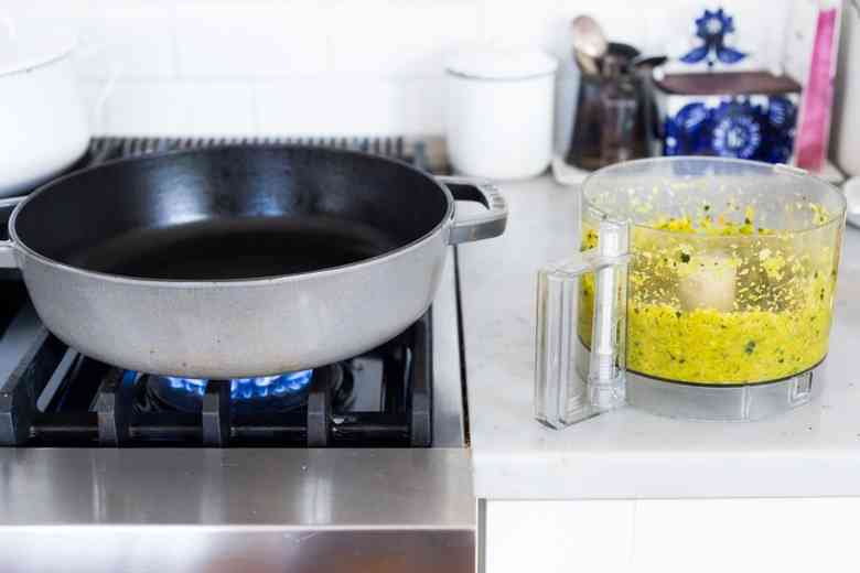 Разогрейте кокосовое масло в сковороде или сотейнике на средне-сильном огне. Добавьте на нее полученную пасту и готовьте около 3-4 минут (пока она слегка не зарумянится), постоянно помешивая. Затем добавьте воду, перемешайте и доведите до кипения.