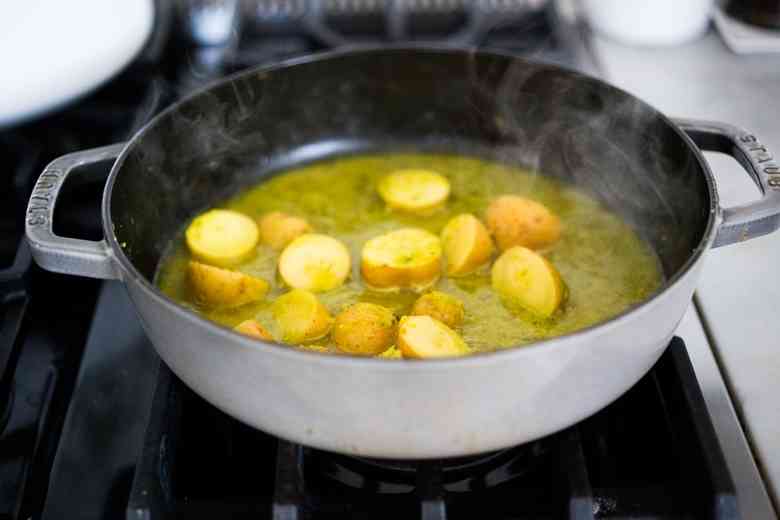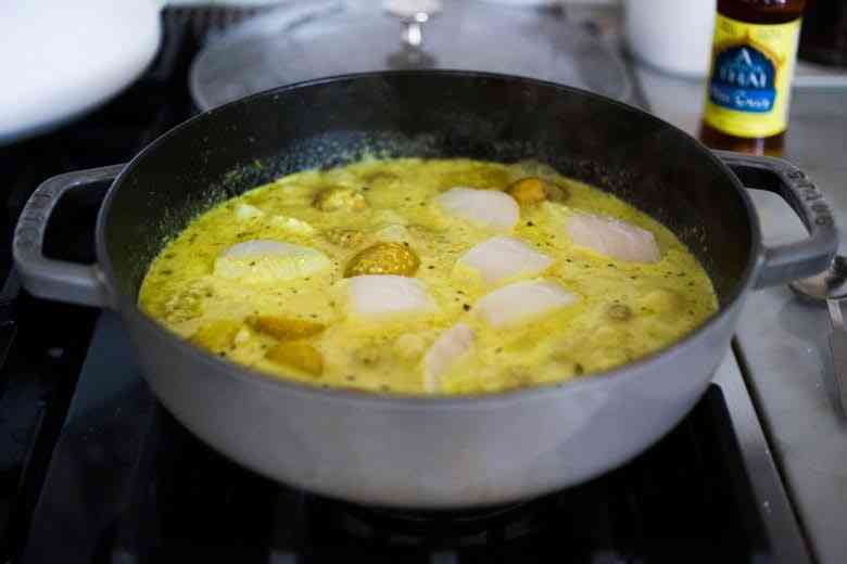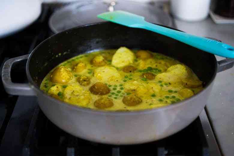 Добавьте картофель на сковороду, накройте крышкой и тушите 15 минут. Затем снимите крышку и немного уменьшите количество жидкости, дайте покипеть несколько минут. Добавьте соль, рыбный соус, сок лайма, кокосовое молоко и хлопья чили (если используете).