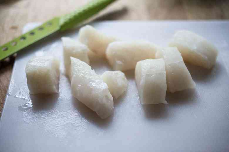 Порежьте филе рыбы на крупные кусочки.