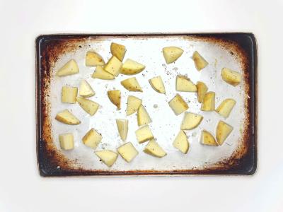 Картофельные кусочки сбрызните оливковым маслом, посолите и поперчите, тщательно перемешайте руками и выложите на противень. Запекайте 20-25 минут до полной готовности.