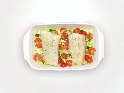 В форму для запекания влейте приготовленный соус с сыром и Песто, сверху выложите кабачок и помидоры, а на овощи поместите треску. Сбрызните рыбу оливковым маслом и приправьте солью и перцем.