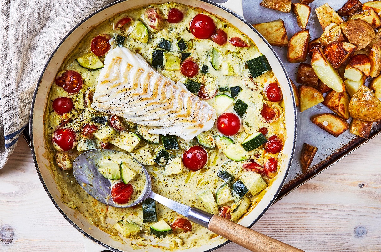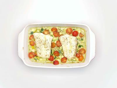 Если вы любите рыбу с овощами, то обязательно попробуйте этот рецепт. Для этого приготовьте сливочный сырный соус и запеките в нем кабачки, помидоры и филе трески. А на гарнир приготовьте картофель с хрустящей корочкой.