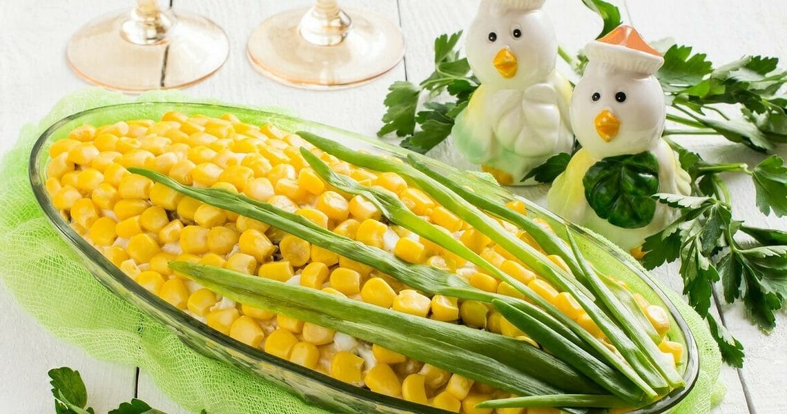 - Сверху разбрызгиваем лимонный сок и посыпаем кукурузой с салатным луком.