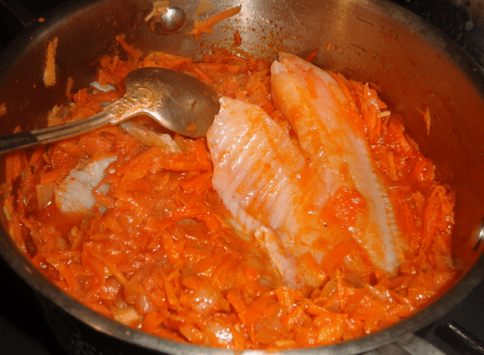 - Очистить и мелко нашинковать лук с морковкой, а потом выложить на рыбу, которая будет обжариваться второй стороной. Все закрываем крышкой и готовим примерно 5-7 минут на медленном огне.