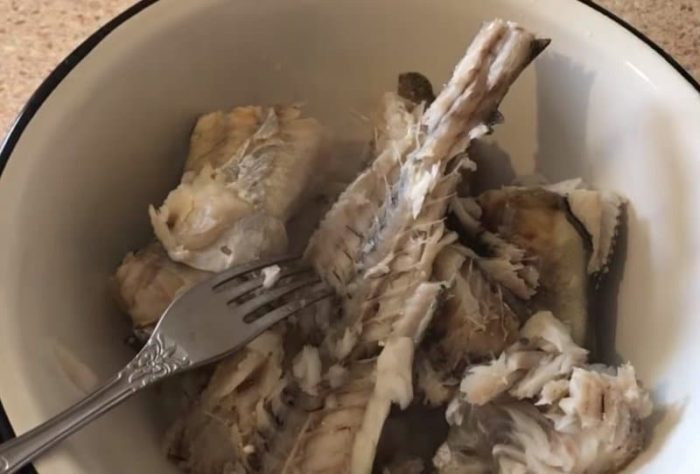 Из отваренной рыбы удалить кости, плавники, кожу, разобрать на волокна.