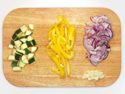 Разогрейте духовку до 220 градусов. Кабачки нарежьте небольшими кубиками. Из перца уберите семена и нарежьте тонкими полосками. Красный лук почистите и нарежьте тонкими полукольцами. Очистите и мелко нарежьте чеснок.