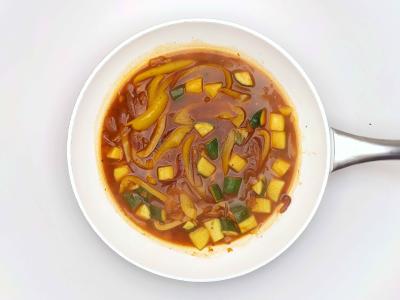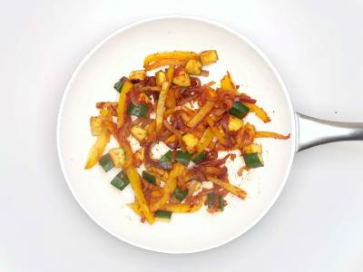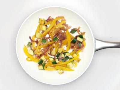 Красный лук и желтый перец с щепоткой соли обжарьте на оливковом масле на сильном огне в течение 5-8 минут до размягчения. Затем добавьте кабачок и чеснок и жарьте еще 5 минут.