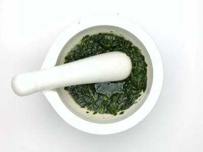 Базилик мелко нарежьте, включая стебли. Выложите его в ступку с 2 столовыми ложками воды и щепоткой соли. Раздавите в однородную пасту, затем добавьте 1 столовую ложку оливкового масла. Альтернатива — использование блендера. Либо можно просто как следует измельчить базилик ножом.